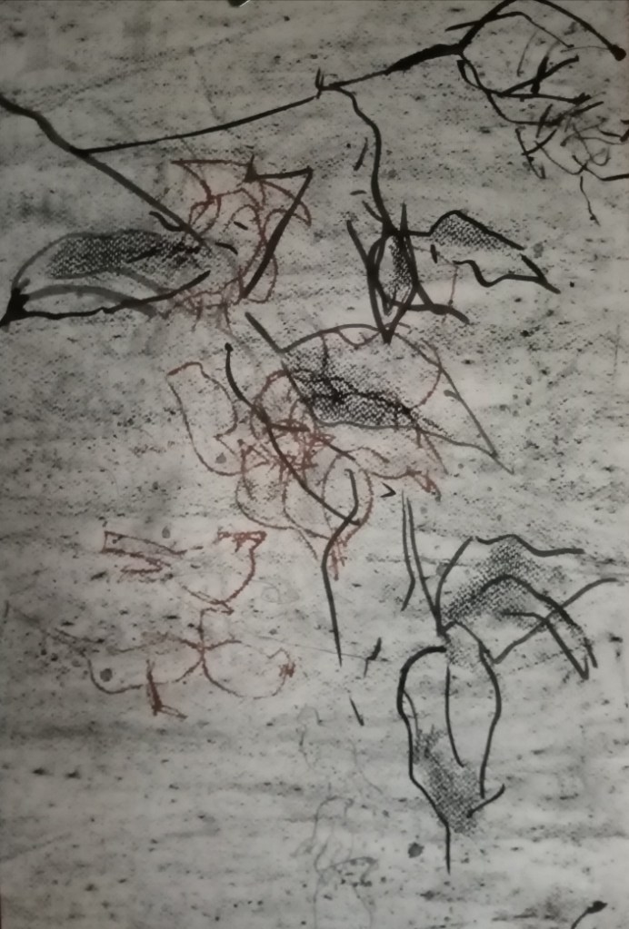 This is a blind drawing done in my garden while observing life around me. I used homemade charcoal, indian ink and monoprint in this drawing.